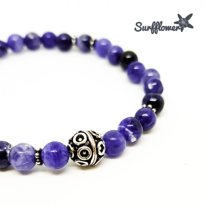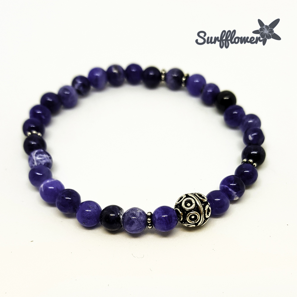 Der Sodalith spielt eine wichtige Rolle als Schmuck-u.Heilstein und kommt in der Natur in den Farben graublau bis dunkelblau vor. Dem Sodalith wird nachgesagt, daß er Mut, Ausdauer und das Selbstbewustsein fördert und in uns das innere Gleichgewicht wieder herstellt. Er fördert die Begabungen und unterstützt so unsere künstlerischen Fähigkeiten, Wahrnehmungen und Konzentration zu verbessern. In unserem Armband Blue Ornamental ist eine kleine silberne Ornamentkugel mit zusätzlichen Zwischenteilen aus 925/-Sterlingsilber eingearbeitet. Das Band ist mit Stretchband aufgefädelt damit es sich gut dehnbar über das Handgelenk anziehen läßt. So eignet es sich auch als Meditations-Armband oder Yoga-Armband an eurem Handgelenk.