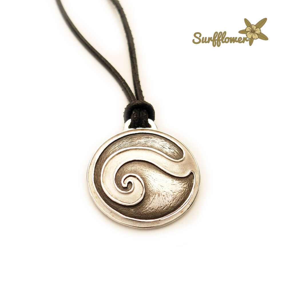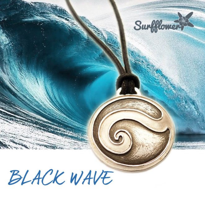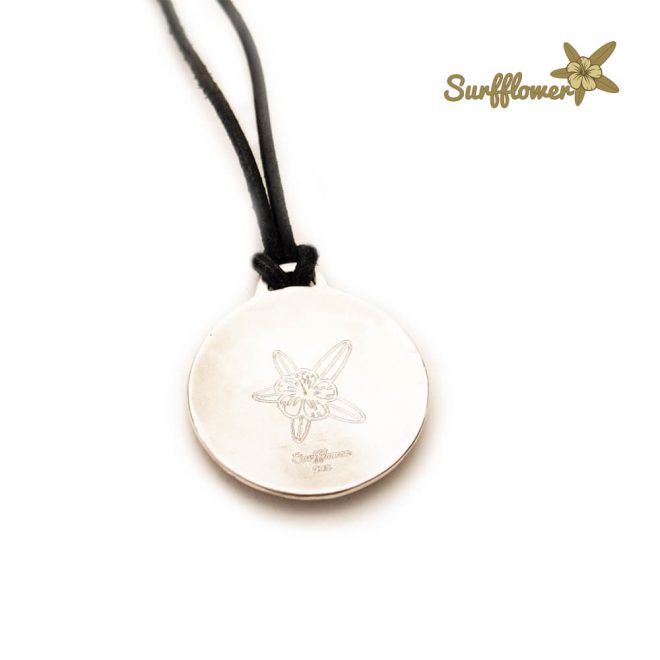 Auf der Rückseite des Schmuck Anhänger Black Wave ist unser Surfflower-Logo eingraviert.